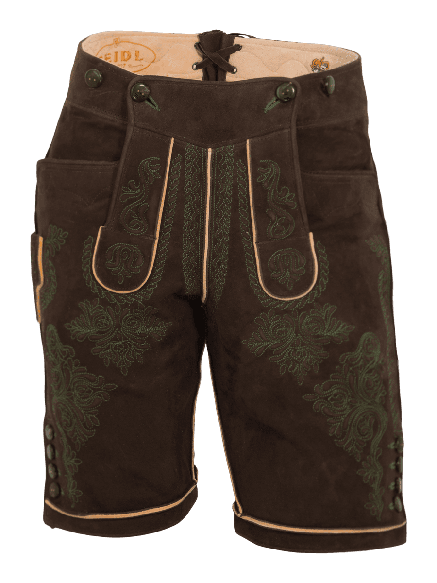 Artikelnr.:ALTAUSSEE H TR Dieser Lederhosen-Träger aus sämisch gegerbtem Hirschleder ist mit traditionell grünen Stickereien ein absoluter Klassiker.